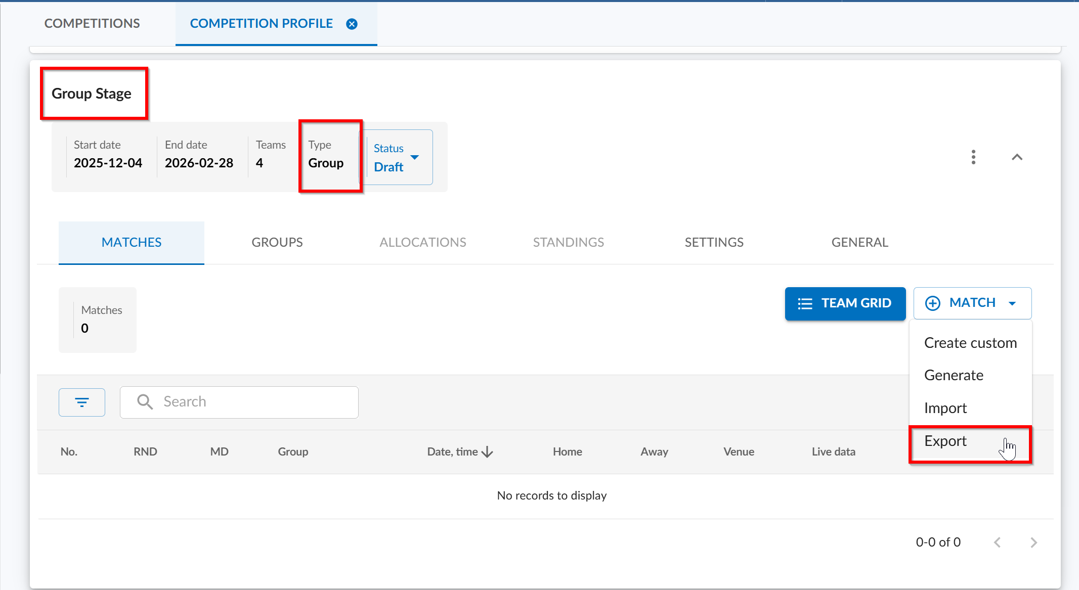 Once you have created the competition stage (Round Robin, Knockout, or Group Stage) and added the teams to the Team Grid as described in Step 3, you can download the corresponding fixture template by clicking the “+ Match” button and selecting “Export”.