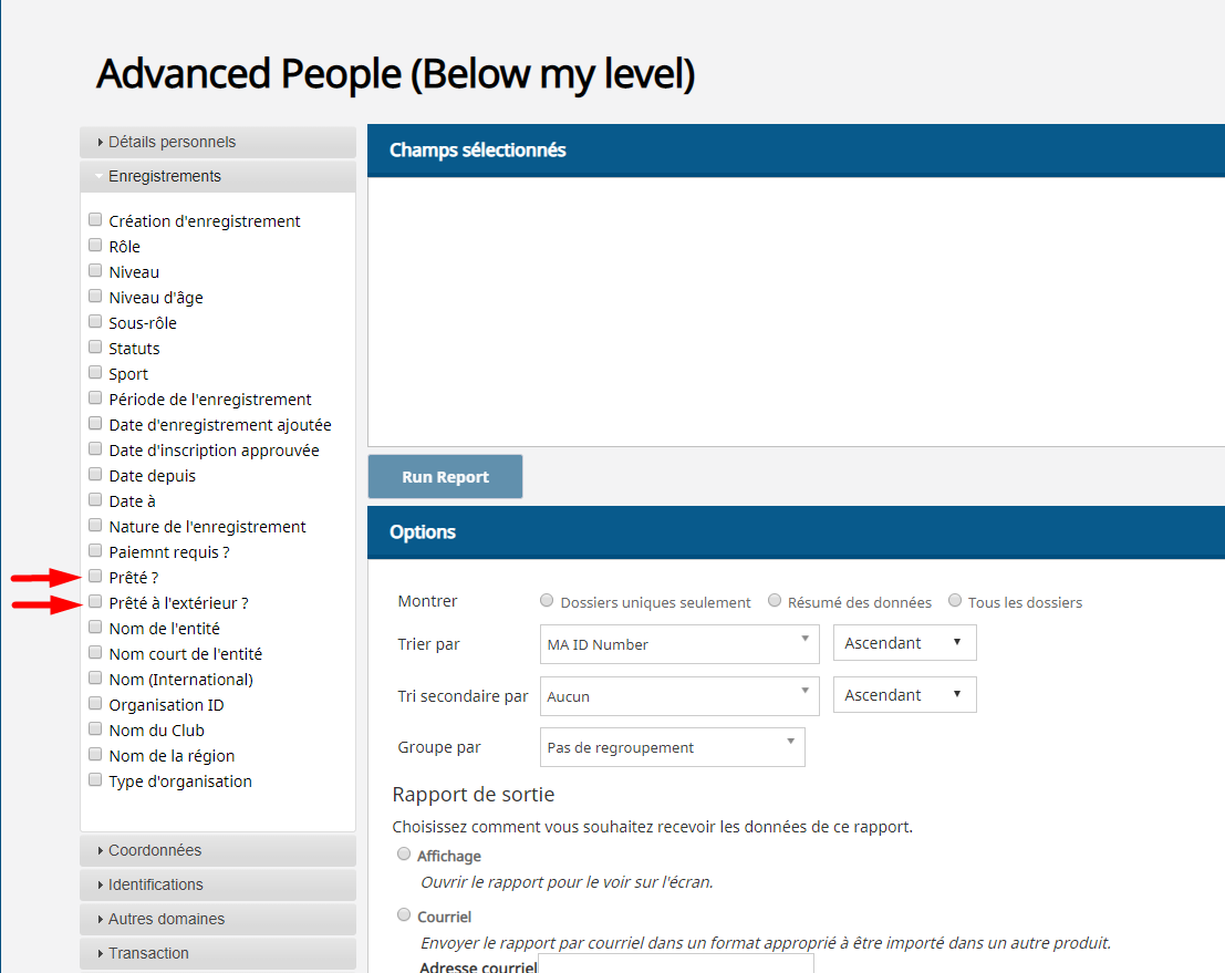Pour utiliser les champs de rapport "Prêté à l’extérieur??" ou 'Prêté?', assurez-vous de filtrer ces champs pour qu'ils soient égaux à «Oui».